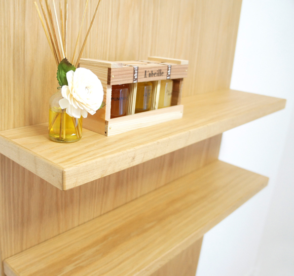 壁にアクセントとしてナラの木を取り付けております!